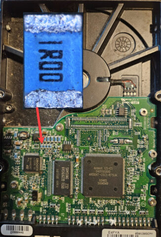 This shot shown is taken for a hard drive circuit board with the insert showing a small resistor magnification at approx. 7x. This was achieved by adding a Nikon PK13 extension tube to the camera for additional magnification above 5x. Exposure was set at approx. f3 (somewhere between between f2.8 and f4)